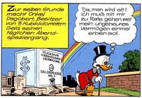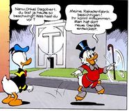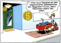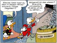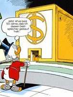 Beim Wettstreit mit dem Maharadscha von Zasterabad gibt Dagobert sein „Kleingeld“ aus. Er hat noch 100 Kubikmeter im Keller (hydraulisch öffnender Zwischenboden). Der Geldspeicher bleibt unversehrt.