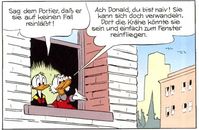 Dagobert schaut hier ebenfalls aus einem Fenster in einer Wohngegend.