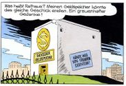 Intro des Geldspeichers als eigenständiges, würfelförmiges Gebäude.