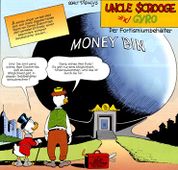 Dagobert wechselt sein Geld in Banknoten und lädt es in einen fernsteuerbaren Kugeltank.