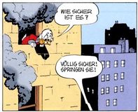 Dagobert springt auch hier aus einem Fenster in einer Wohngegend.