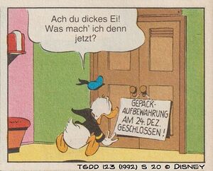 Wieviel Kummer und Sorgen bereiten uns wohl jene Übel, die gar nicht eintreten.Frau Dr. Fuchs erwähnt dieses Zitat sinngemäß in einem Brief an HD Heilmann (2001): "Auch fand ich auf einer Toilette den Spruch: Die schlimmsten Sorgen sind jene, die man sich umsonst macht. Ich hoffe, ich habe diesen Spruch auch einmal bei den Ducks benutzt." Laut dem Interview von Sebastian Turner mit Erika Fuchs (DD 66 [1988], S.17) heißt der Wortlaut: "Wieviel Kummer und Sorgen bereiten doch jene Übel, die dann nie eintreten". Möglicherweise geht es auf ein noch älteres Zitat von Seneca zurück (Brief an Lucilius, II, 6): "Frag Dich selbst: "Quäle oder gräme ich mich etwa grundlos, und mache ich etwas zum Übel, was es gar nicht ist?"" | |